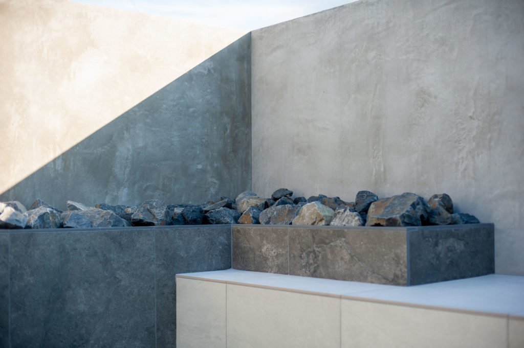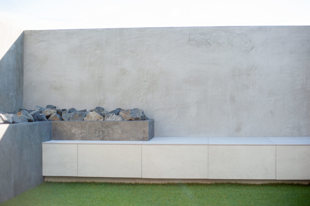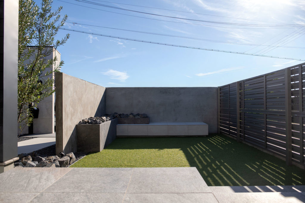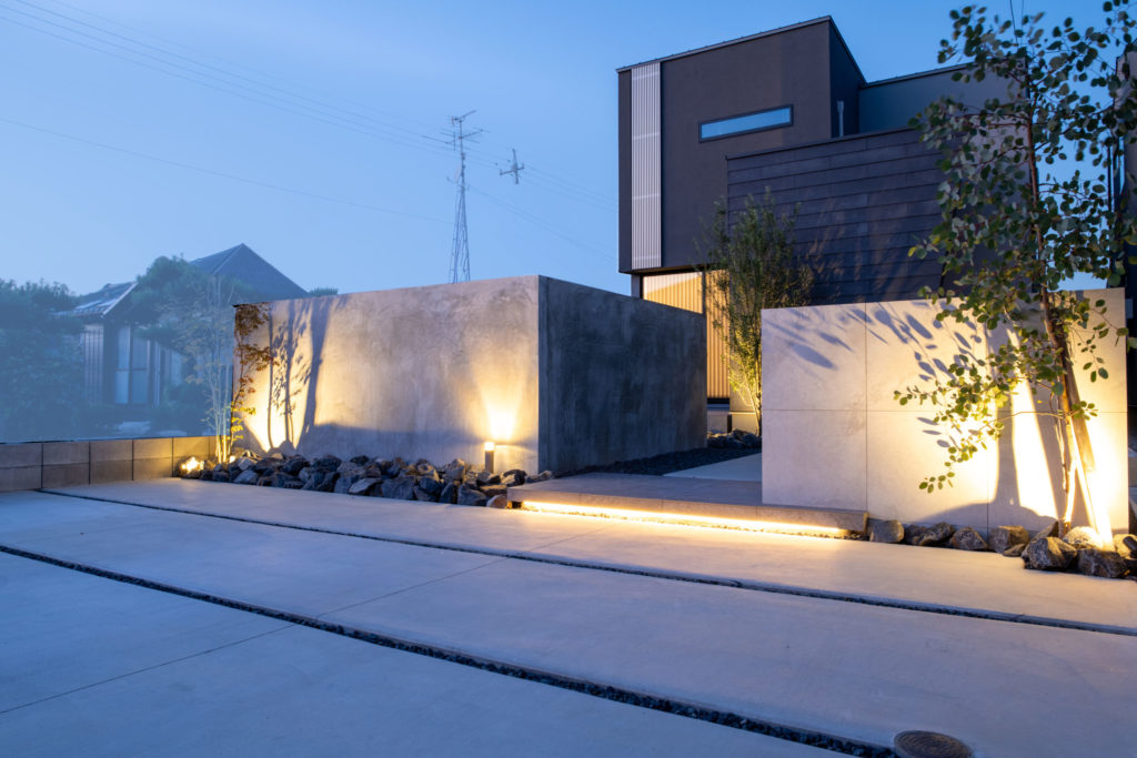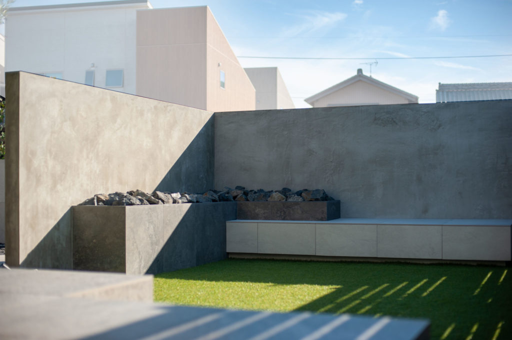 アプローチ側には新たに目隠し塀となるモルタルデザインの壁を、