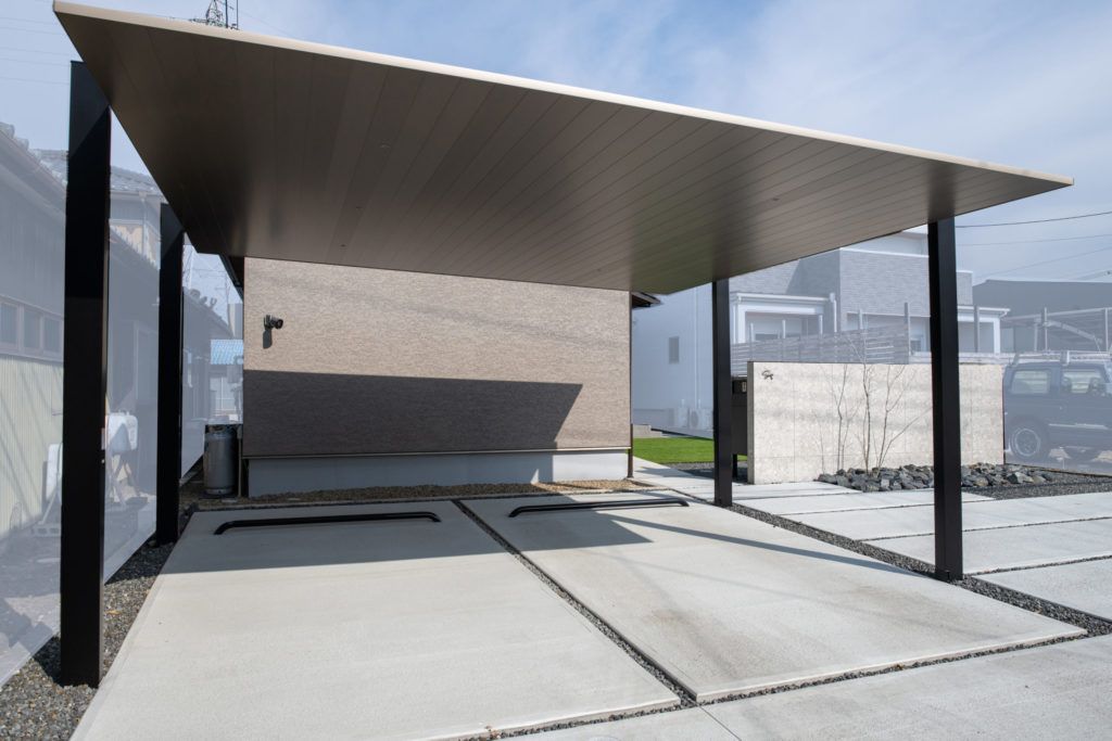 柱・梁はブラックに、屋根材はシャイングレーFを採用して高級感のある仕上がりになっています。