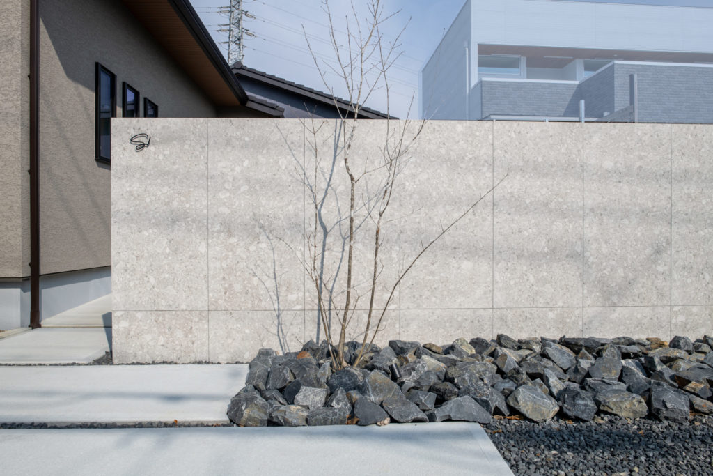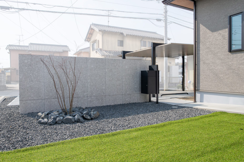 幅4.2mの特大サイズの門柱は道路からの目隠しも兼用としており、迫力のあるお家の顔となっています。